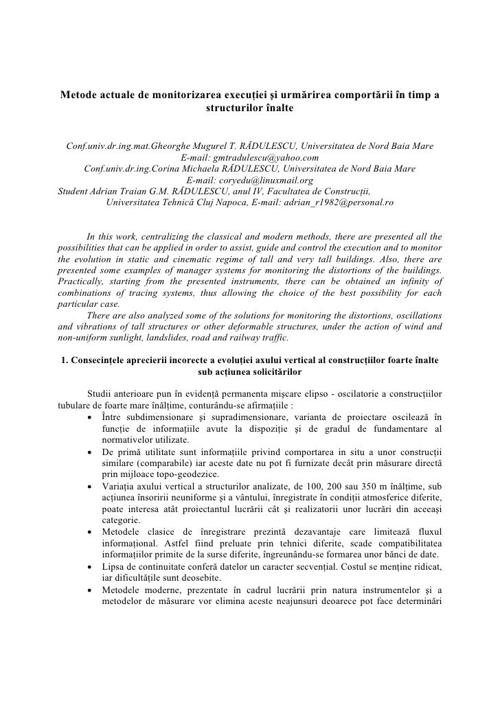 Suntem o echipa de profesionisti in urmarirea comportarii in timp a constructiilor si avem ani de experienta in acest domeniu. 2.explicare şi interpretare (explicarea şi interpretarea unor idei tamaioaga,g. Metode clasice (statii totale), metode gnss (sisteme de poziţionare globală: